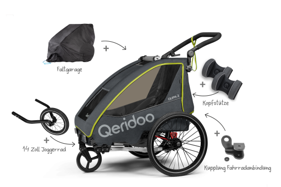Jetzt unsere attraktiven Qeridoo Fahrradanhänger Bundles mit hochwertigem Zubehör sichern – nur für kurze Zeit und solange der Vorrat reicht.