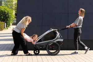 Mit der Deichsel verbindest Du den Kindersportwagen schnell, sicher und einfach mit Deinem Fahrrad.