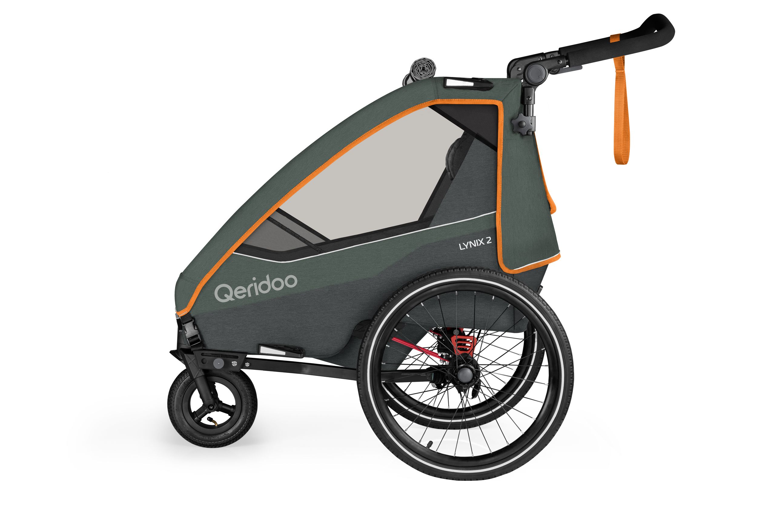 Das luftgefüllte Buggyrad ist um 360° drehbar und schnell über die Funktionstasten für den Trailer-Modus zu entnehmen. Zum sicheren Joggen stellst Du es einfach fest.