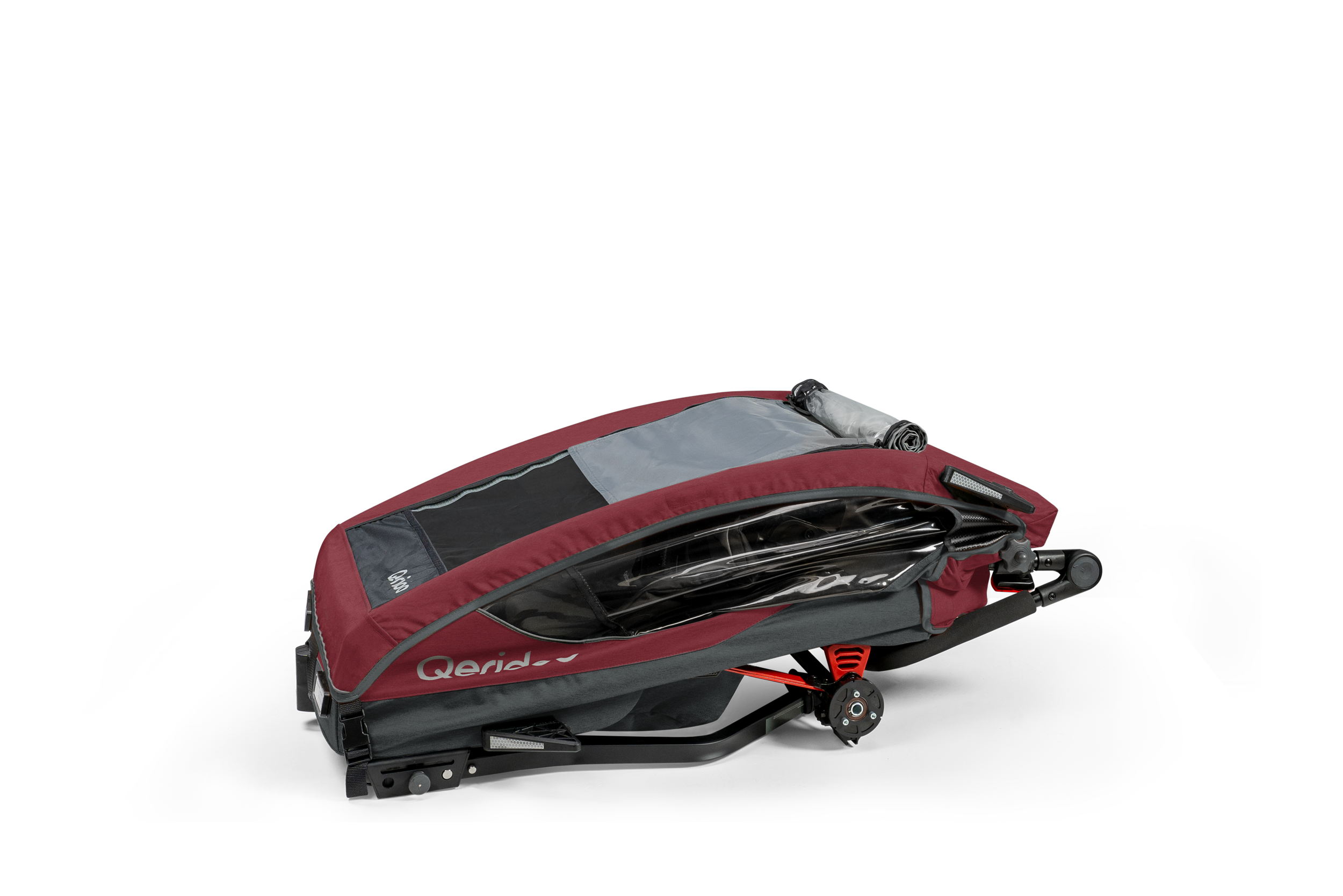 Die mitführbare Deichsel ist griffbereit unter der Kabine verstaut, sodass sich Dein Qeridoo jederzeit mühelos an Dein Fahrrad oder E-Bike anhängen lässt. -
